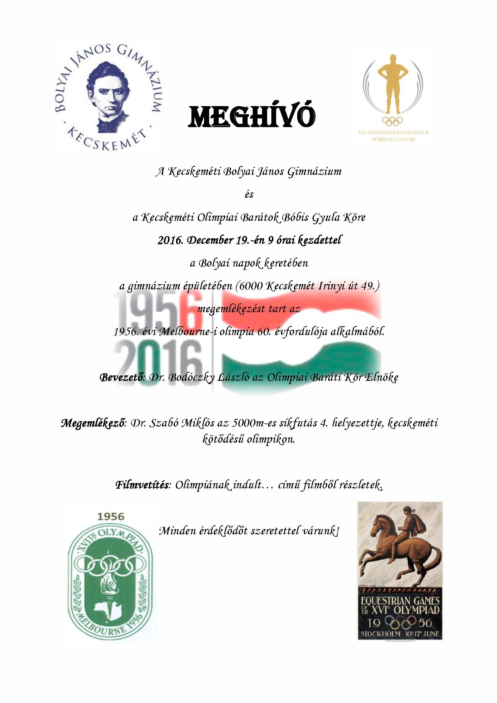 A Kecskeméti Bolyai János Gimnázium és a Kecskeméti Olimpiai Barátok Bóbis Gyula Köre 2016. December 19.-én 9 órai kezdettel a Bolyai napok keretében a gimnázium épületében (6000 Kecskemét Irinyi út 49.) megemlékezést tart az 1956. évi Melbourne-i olimpia 60. évfordulója alkalmából.
