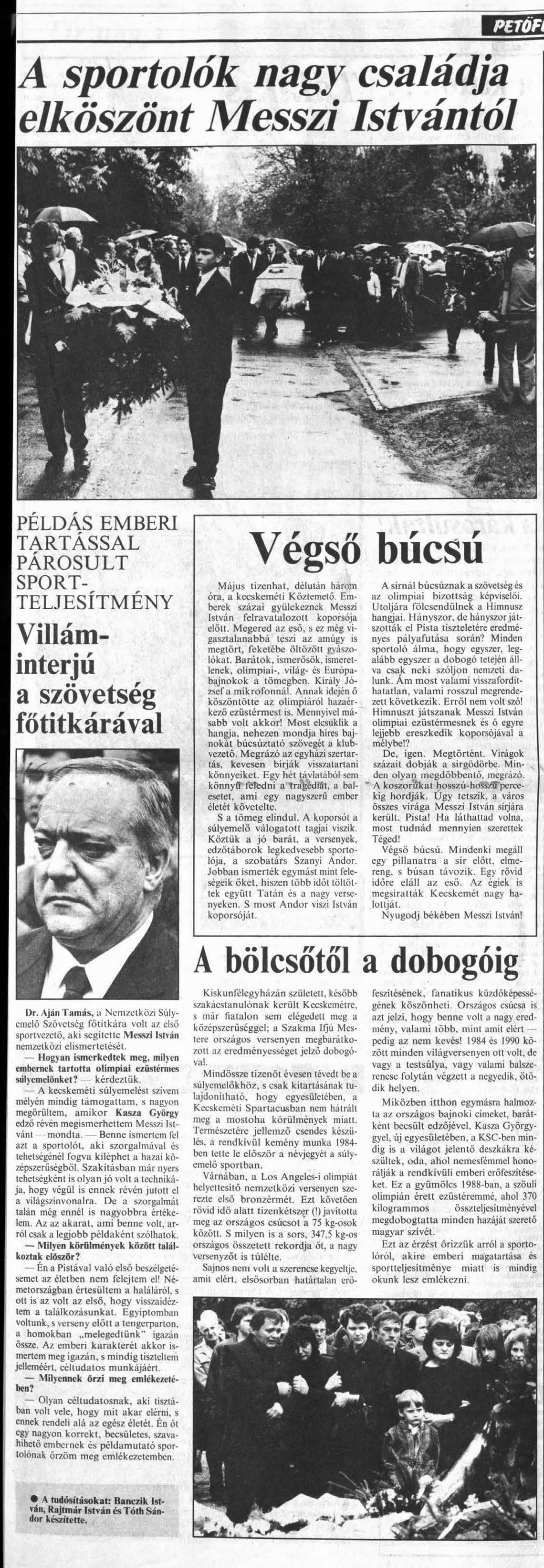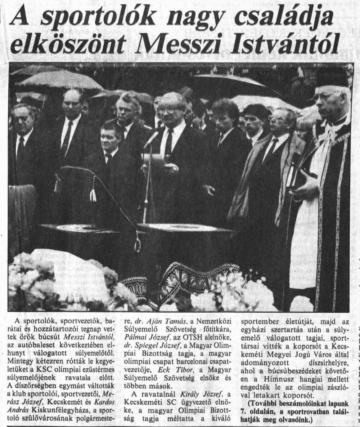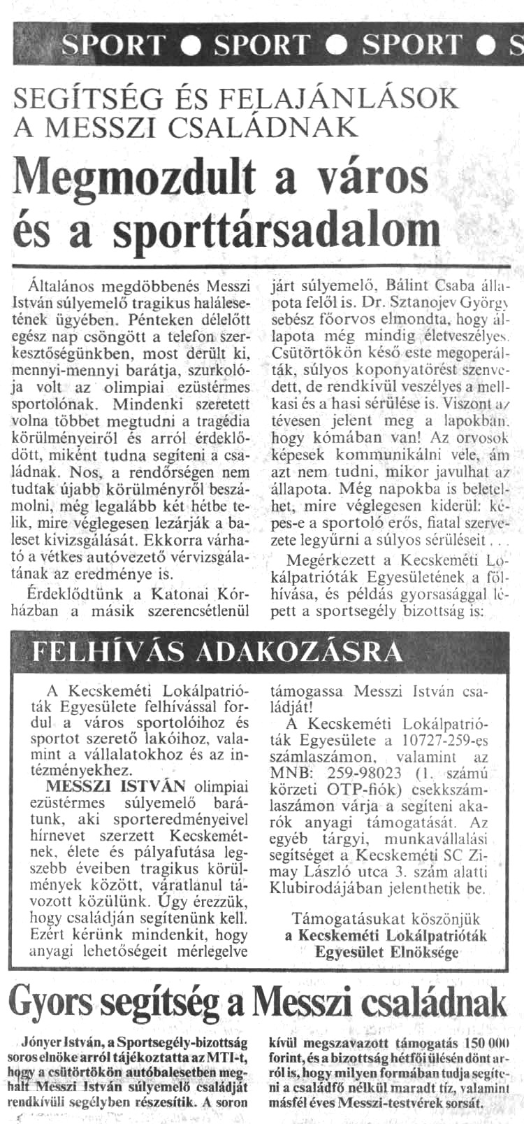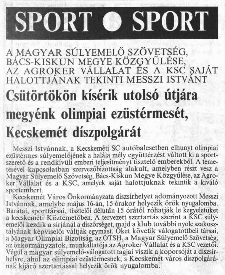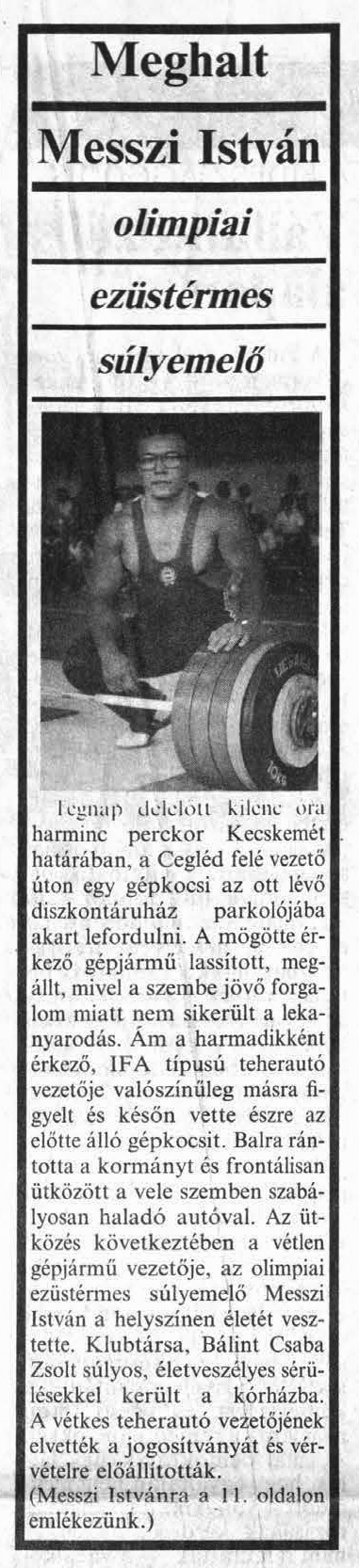 Szomorú dátumhoz értünk. Ma harminc éve, hogy tragikus hirtelenséggel, balesetben eltávozott olimpiai ezüstérmes súlyemelőnk, a városi sportcsarnok névadója, Messzi István.